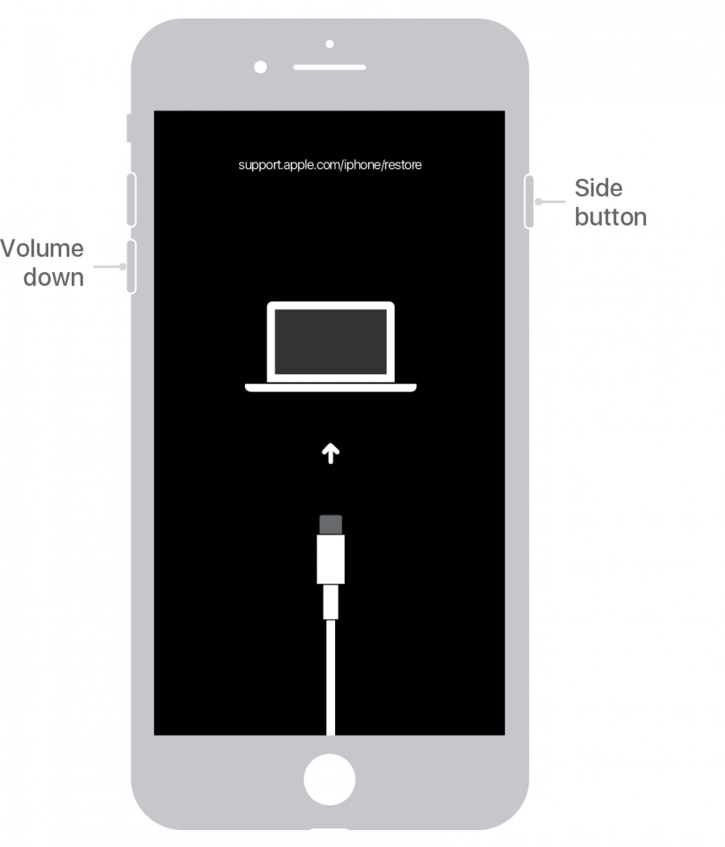 - Plug your iPhone into your computer while holding either the side button (on an iPhone X or later, 2nd gen SE, iPhone 8, and iPhone 8 Plus), the volume down button (on an iPhone 7 or an iPhone 7 Plus), or the Home button (on an SE 1st generation, and iPhone 6 and earlier).